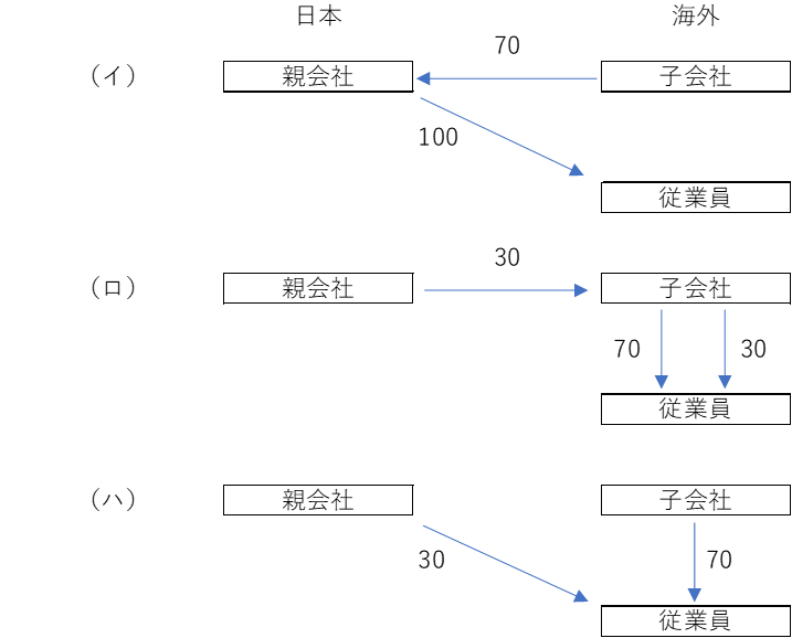 ・ 較差補填金がある場合、下記の3つパターンが考えられますが、いずれの場合も「子会社の給与負担 70」、「従業員の受給額 100」になります。